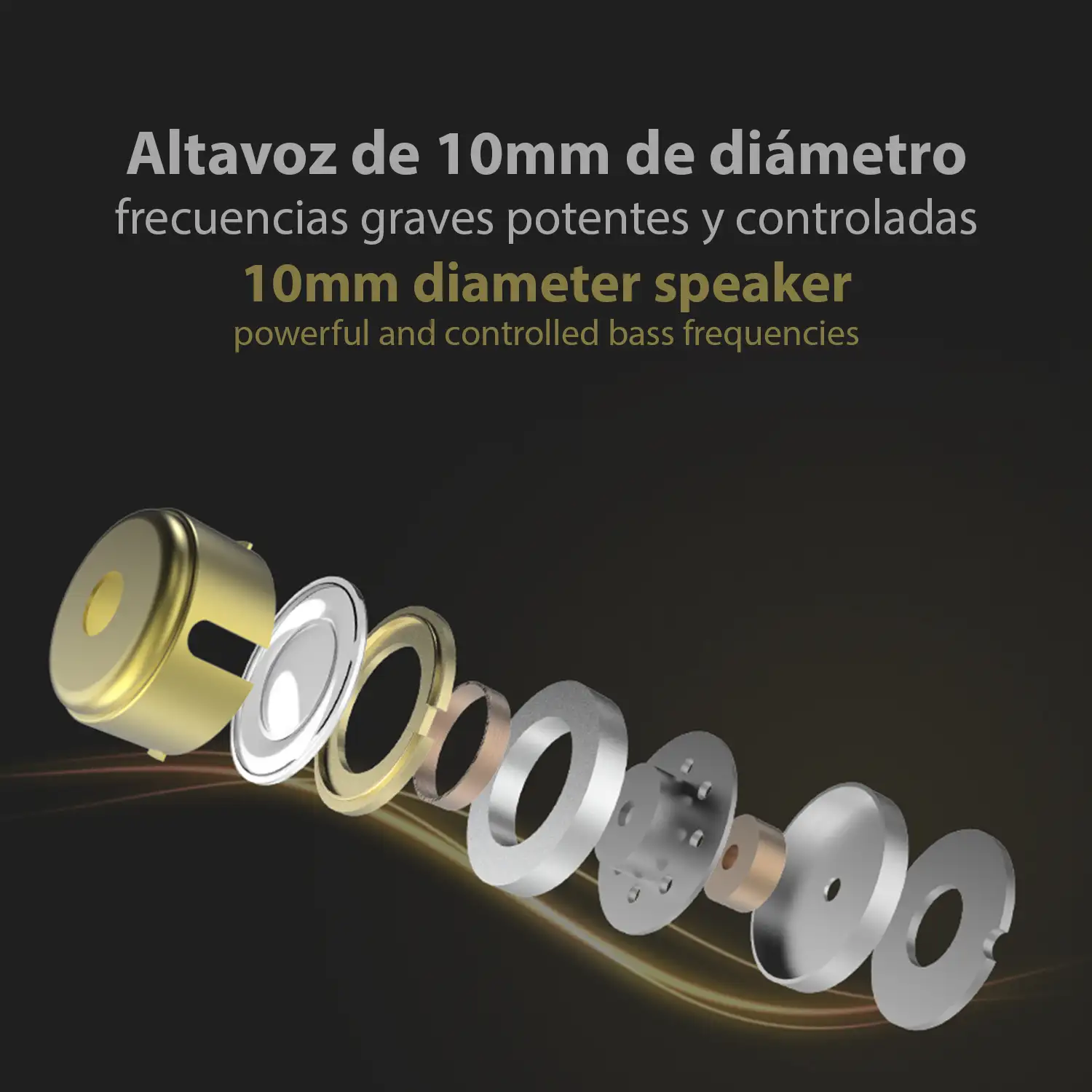 • El tamaño del altavoz dinámico de 10 mm tiene la calidad de sonido del dinámico tradicional de 13-14mm. Lleno de voz, baja frecuencia suave, en comparación con la generación anterior de imanes de bobina móvil, el volumen aumenta en un 30% y la respuesta de frecuencia aumenta en 1KHz la sensibilidad, de posición en 5dB.