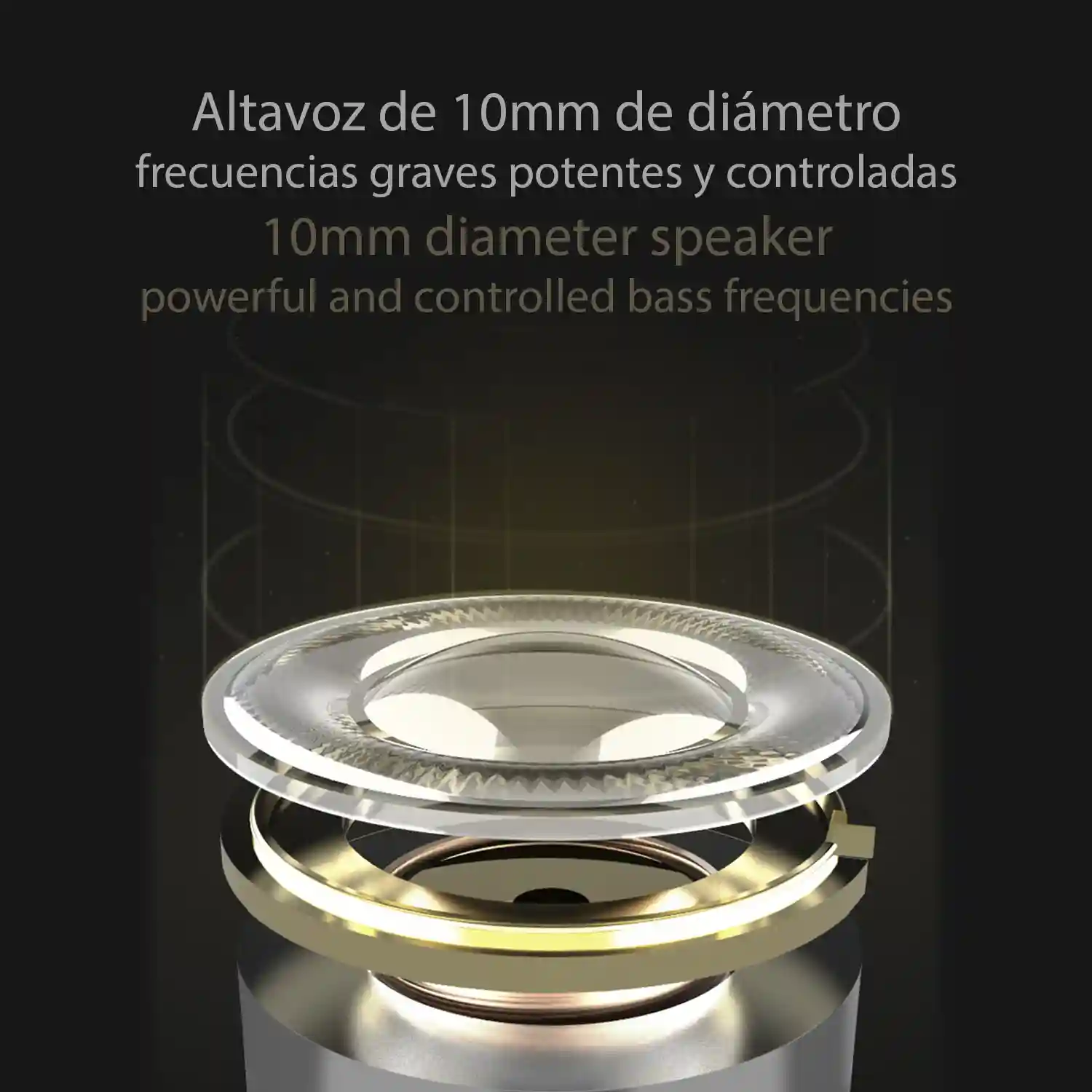 • Unidad dinámica doble de 10 mm de diámetro, de media y baja frecuencia: diafragma compuesto de polímero, respuesta transitoria rápida.