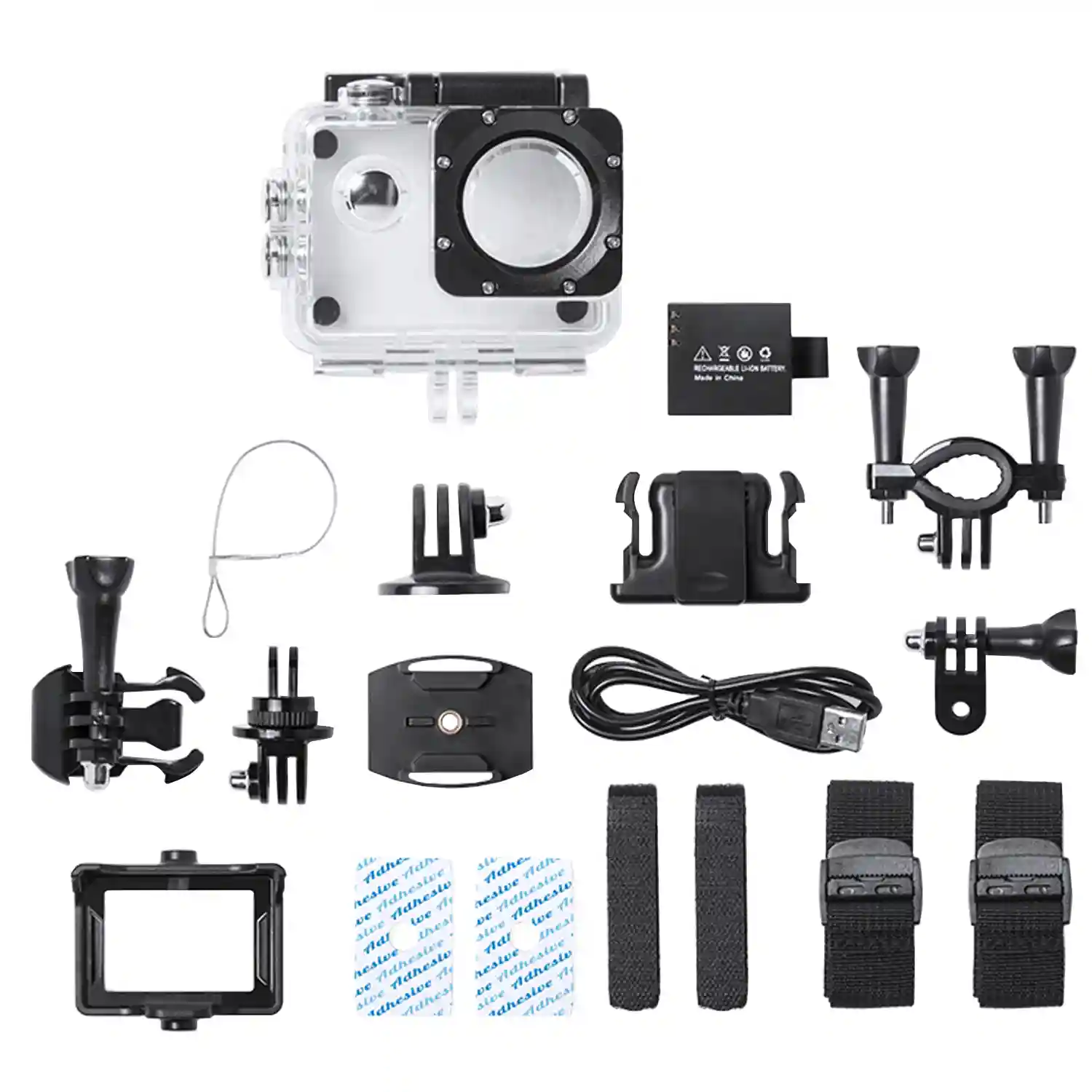 • Accesorios: carcasa estanca, soporte para carcasa estanca, soporte de clip para carcasa estanca, soporte para manillar bici/moto, clip multifunción, clip de cámara, soporte para casco, correas ajustables, cable USB, manual de instrucciones
