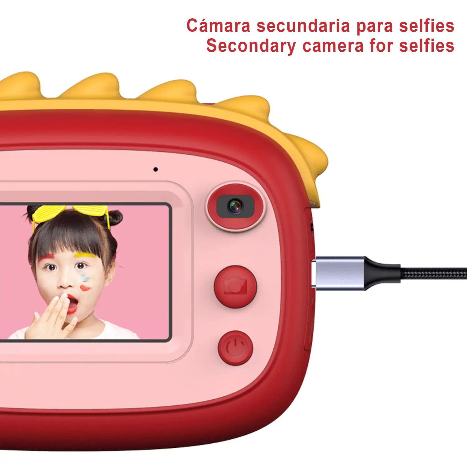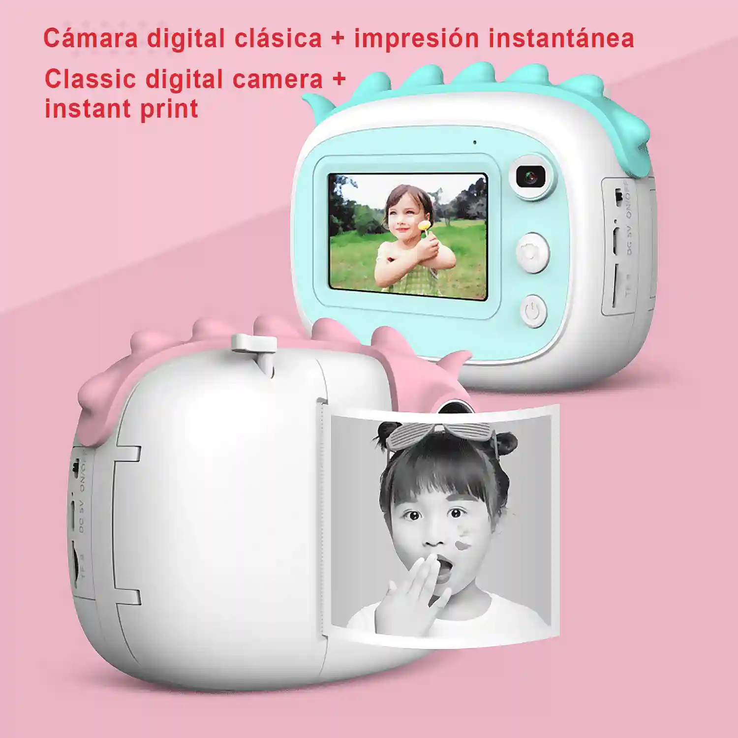 • Cámara digital clásica con función de impresión instantánea. Compatible con tarjetas micro SD.