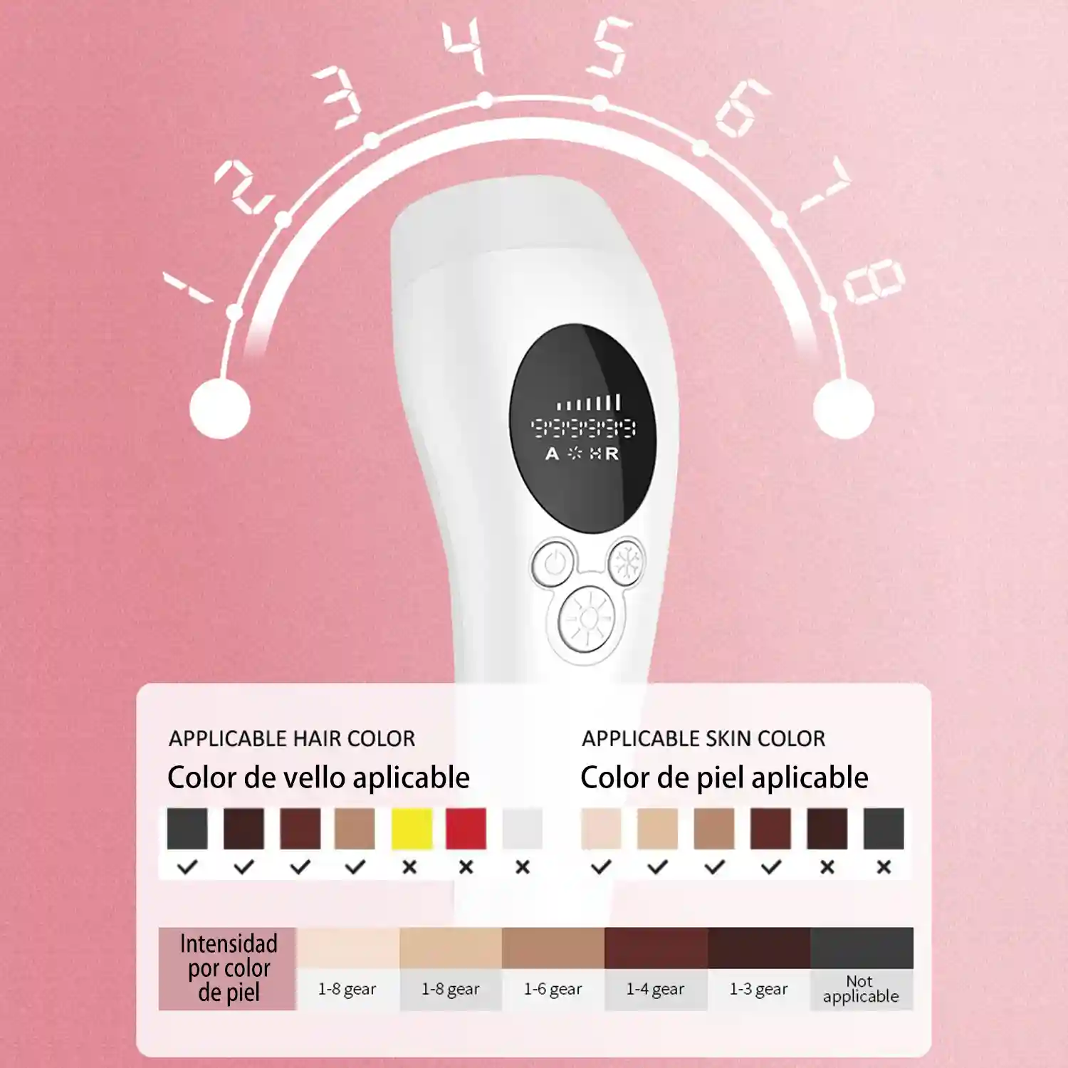- 1. Lámpara hecha de material de cuarzo importado. 2. 990000 golpes de luz pulsante efectiva. 3. 3. Velocidad de parpadeo de 0,9 segundos con pantalla LCD. 4. Flash manual/automático, modos duales seleccionables. 5. 8 niveles de energía ajustables para satisfacer las diferentes necesidades de la piel.
