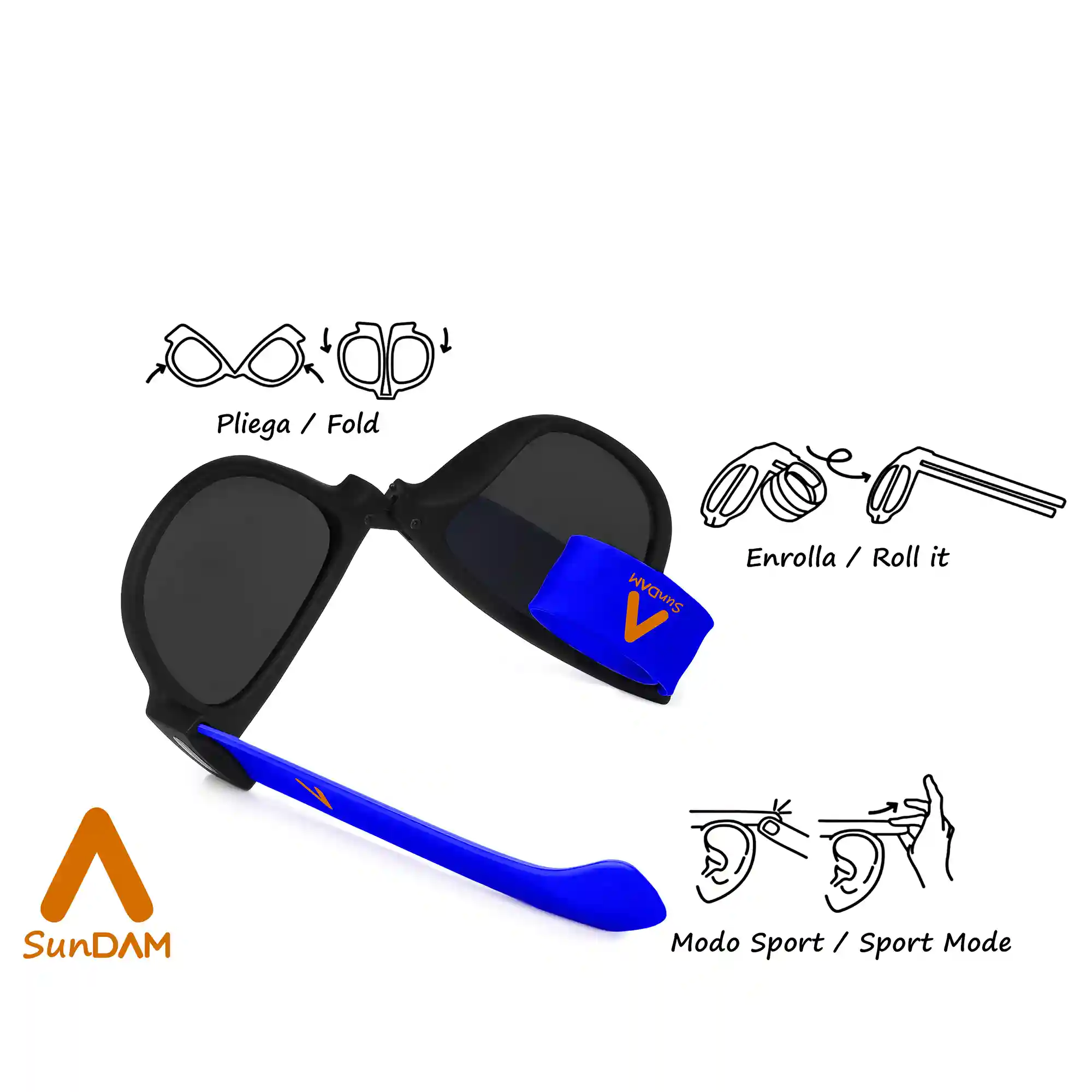 • Puente central plegable: junto a las patillas plegables permite guardar las gafas Sun Dam en lugares reducidos.