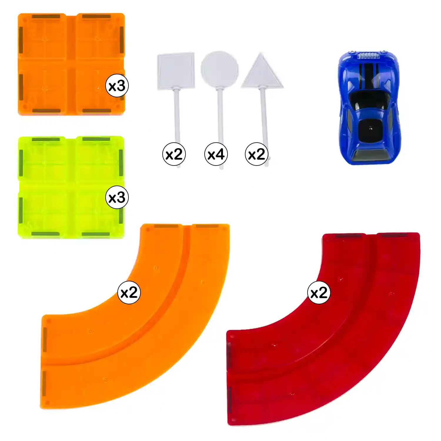 • 19 piezas para crear tus propios circuitos, con señales de tráfico.